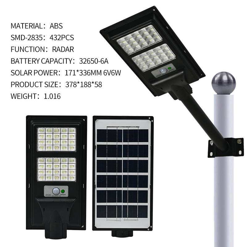 energy Savising High Lumen IP65 Vodotěsní venkovní solární pouliční světlo, SMD 108pcs, 432PC, 648PCS, 864PCS, 1080PC, 1296PC; Sluneční osvětlení LED Slunce má výhody vysoké účinnosti, bezpečnosti, úspory energie, ochrany životního prostředí, dlouhé životnosti, rychlá reakce, indexu vykreslování s vysokou barvou,nízkým útlumem LED pouličních světel, vysoké kvality LED pouličních světel a v podstatě žádné záření. Jsou to typické zdroje zeleného světla. Aplikační oblasti: Přednínebo zadní yardy, tunely, billboardy, budovy, tělocvičny, workshopy, stanice, parky, mýtné stánky, továrny, dálnice, zahrady, budovy a mnoho dalších míst